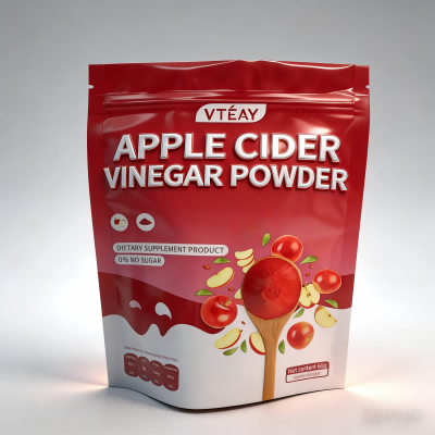 Frons Pomi Cider aceti Zipper Powder Zipper Sta marsupium clare notatum est cum "POMUM CIDER ACETUM" in textu audaci, cum imaginibus vibrantibus pomorum et pulveris trullarum, ut celeris et perspicui operis indicium praebeat. Clavis puncta venditionis sicut "Non Added Sugar," "C% Pulvis purus" et "Dietary Supplementum" eminenter monstrantur ut usores auxilium cito intellegant producti beneficia.